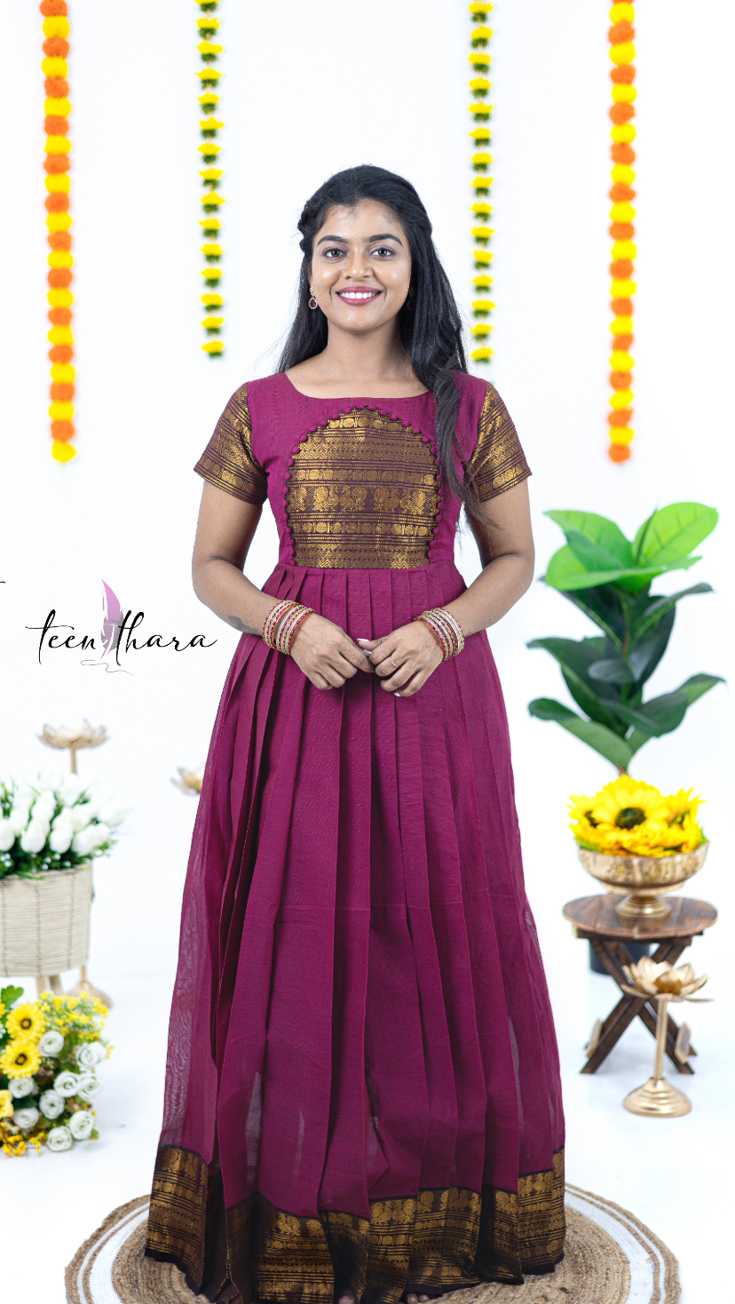 Step into elegance with this rani pink traditional gown featuring rich Zari work and a stunning silk border.